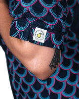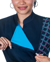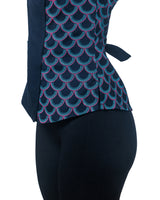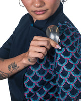 This pattern is inspired by the love of all things mermaid (and our founder having grown up with a firm belief that the job title of "Mermaid" was achievable). Gorgeous, colorful scallops/scales adorn a simple navy coat giving "mystical meets practical."