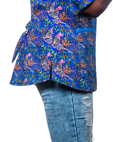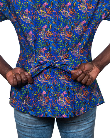 This striking pattern features a blue-violet background, vibrant tropical flora, and a colorful tiger sitting lazily with his leg outstretched and his curious head turned to see what’s up.